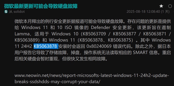 最新的一个win11更新可能会损坏硬盘