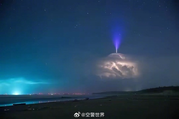 8月23日晚,陆丰市摄影师辛宏彪拍摄到罕见的蓝色喷流闪电