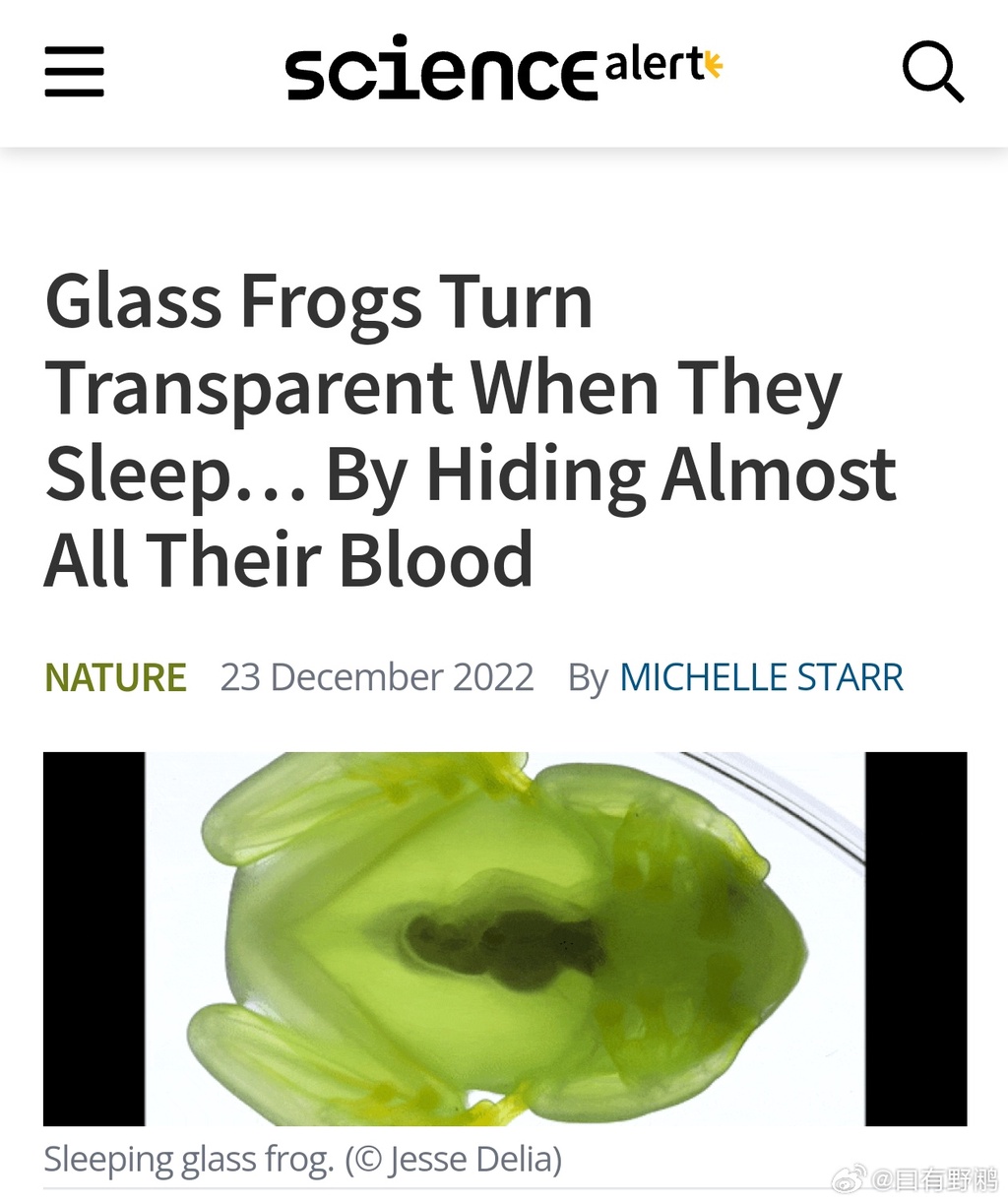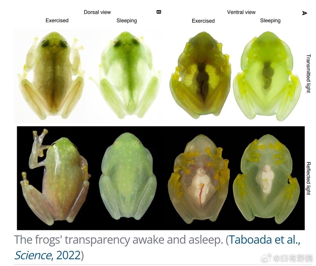 玻璃蛙(Hyalinobatrachium)睡觉时会变透明,是因为它可以将全身血液汇聚进一小块区域(肝脏)内。这样其隐匿在树叶上时,哪怕被逆光照射,也不会投出一个蛙形的阴影而被捕食者发现了。