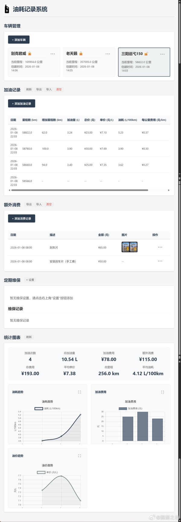 分享自己最近写的一个开源项目,油耗助手。 可以自行简单的部署。可以记录油耗、还有其他花费以及提醒维保