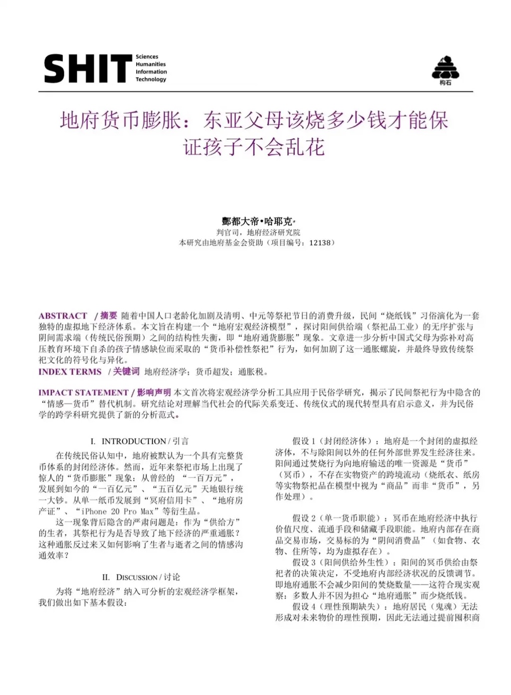SHIT期刊的 地府货币膨胀 一文,原来是有原型的